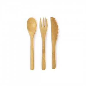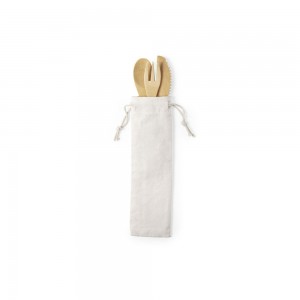 Set couverts - Ensemble de 3 couverts. Fabriqué en bambou, comprenant une fourchette, une cuillère et un couteau. Présentés dans une pochette en coton avec une fermeture pratique.